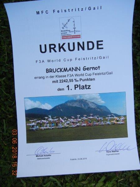 Mit dem Frühjahrsputz und dem darauffolgendem Anfliegen begann die Saison 2018. Der diesjährige Höhepunkt war aber der Weltcupbewerb in der Zeit vom 02. Bis 03.06.2018. Namhafte Piloten aus ganz Europa duellierten sich mit ihrem Können. Nationale und internationale Schiedsrichter bewerteten die vorgeflogenen und genau vorgegebenen Figuren, die die Modellflugpiloten zu fliegen hatten. Ein Novum war auch die computergesteuerte Auswertung, die von einem Team aus dem Zillertal bedient und auch entwickelt wurde. Aus österreichischer Sicht, war bei diesem Bewerb der dem MFG Feistritz/Gail angehörende, mehrfache Weltmeister, Gernot Bruckmann eine Klasse für sich und konnte den Sieg in diesem Bewerb erringen. Die Veranstaltung war international hochrangig vertreten und alle Teilnehmer gratulierten zur gelungenen Veranstaltung. Die Siegerehrung nahmen Bürgermeister Dietmar Mörtl, der auch die wunderschönen Glaspokale, gestaltet von der Glaskünstlerin Malowerschnig aus Weißbriach, in Beisein vom Obmann Hans Wallner, dem Bundesreferent Dietmar Waltritsch und dem Landessektionsleiter Peter Zarfl, vor.